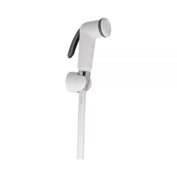 ABS shut-off hand shower, textile reinforced flexible hose cm.120, ABS wall hower hanger. Available finishings: white&grey-black&grey-white&chrome-black&chrome-white&gold-black&gold-all chrome-with brass flexible hose